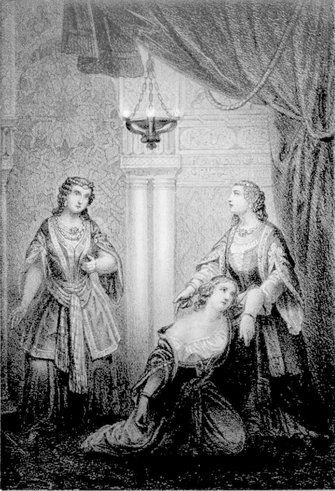 Sus negros ojos fijos en el príncipe, con una espresion ardiente y melancólica, brillaba con no sabemos qué fuego dulce, concentrado, bajo la sombra de sus negras y convexas pestañas: su boca entreabierta, por la que parecia salir una alma llena de sufrimiento y de dolores en un continuo suspiro, dejaba ver sus voluptuosos labios contraidos por una triste sonrisa y pálidos como sus megillas: por último, sus largos y brillantes cabellos caian en flotantes rizos sobre sus hombros y sobre sus espaldas, y era alta, esbelta, magestuosa, y vestida únicamente con una larga túnica de lana blanca, sujeta en el cuello, de mangas perdidas y suelta enteramente hasta cubrir los pies, ocultando las formas de aquella singular belleza bajo su ancha plegadura.