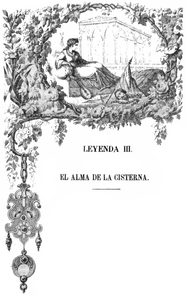 El lugar en que el incógnito se habia detenido, era sumamente pintoresco; anchas y tupidas cortinas de yedra cubrian las cortaduras de aquel ensanchamiento circular que tenia la forma de un gigantesco anfiteatro. Las dos estrechas aberturas por donde entraba y salia el rio, estaban unidas como por un pabellon flotante, por cortinages de enredaderas que descendian hasta la corriente: sobre los bordes de las cortaduras, como verdes cabelleras, se levantaban las frondas odoríferas de los árboles frutales; brillaba la luna en la tranquila agua del remanso, y en los blancos muros de una casita que se veia en la márgen opuesta entre álamos y cipreses: delante de esta casa se veia un jardin, el perfume de cuyas flores traia consigo el aura de la noche, y un ruiseñor enamorado cantaba entre la espesura uniendo sus cadenciosos trinos al monótono murmullo del rio.