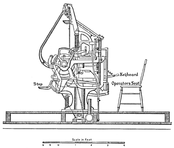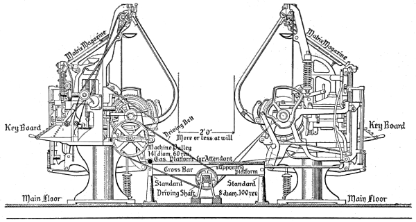In placing machines allowance must be made for[12] space sufficient to pass around and between them, and for seat of operator in front. A liberal allowance is 7x10 feet.