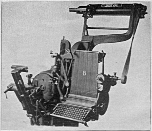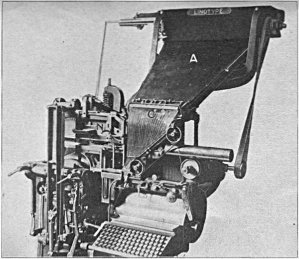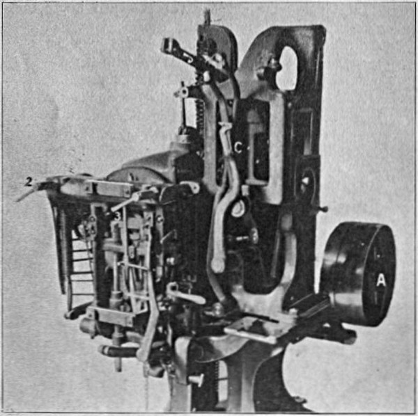 Now, with machine in position (Fig. 6), put on face plate N (Fig. 7), which is held by the three cap screws 2, 3 and 4 (Fig. 6), and magazine A and flexible front and glass C (Fig. 7) and connect spaceband lever, spaceband transfer carriage, distributer shifter carriages, line delivery carriage, assembling elevator, etc. Reversing these directions will, of course, show how to take the machine apart.
