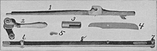 First set eccentric screw 6 (Fig. 15) on inner end of stopping and starting lever connection rod 8 (Fig. 15) so as to take up all lost motion between it and the vertical starting lever. Then set the eccentric screw 7 (Fig. 15) on outer end of the connecting rod 8 so as to take up all lost motion between it and vise automatic stop lever 4 (Fig. 15). To do this, pull out the vise automatic stop lever 4 with your finger until the inside end bears firmly against the vise automatic stop rod 1, which, in turn, comes in contact with the vise automatic stop mold disk dog 3 (Fig. 15); then pull out the starting and stopping hand lever 2 (Fig. 15) until machine starts. At the time when the machine starts the eccentric screw 7 should touch the outer end of the vise automatic stop lever 4, then there would be no lost motion and the vise automatic would act as follows: