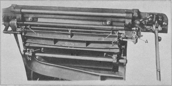 The assembler chute spring A, which lays between spaceband chute B and assembler rail C, should be set as low as its banking piece “a” will[37] permit. Its lower end should be about midway between the lower end of the spaceband chute B and matrix catch spring E, and in line with them.