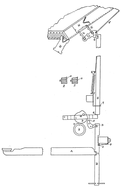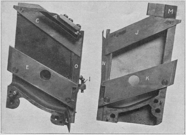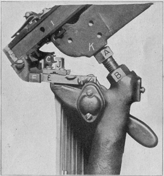 The assembler slide brake H and spring L should be adjusted to prevent the assembler slide from jumping ahead to the left or continually vibrating as the matrices enter. If the assembler vibrates it makes it impossible for the operator to read the line, and the last letter will sometimes fall out when the assembling elevator is raised. This is caused by the brake H wearing at points 3 and 4, which lessens the tension of the spring L and takes up the space between bottom screw J and brake lever K at point 6, which should be about 1-32 inch. If brake H is not too badly worn at points 3 and 4 this trouble can be obviated by strengthening spring L[38] and turning up screw J until you have about 1-32 inch space at point 6. Be careful not to get too much space at point 6, or the assembler slide would not return when the line has been released from the assembling elevator.