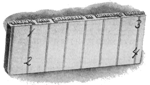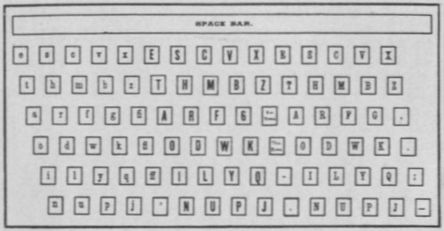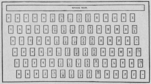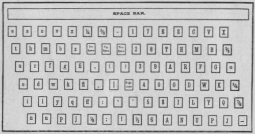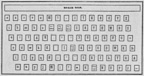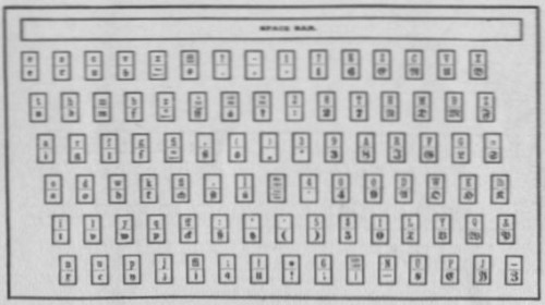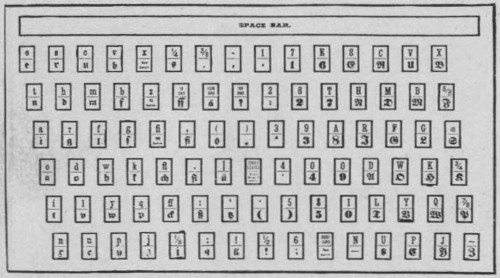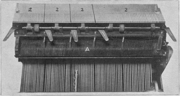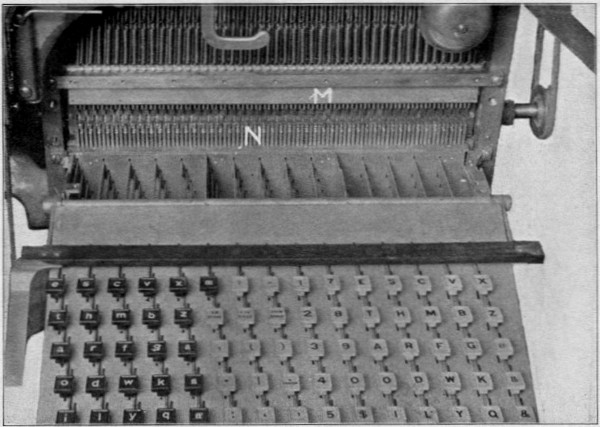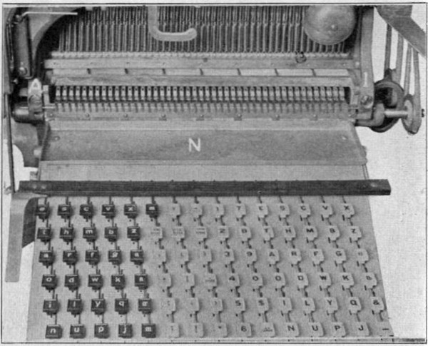 Then put on keyboard C (Fig. 6) and put in rods B (Fig. 6), which are numbered consecutively, beginning with No. 1 at the left. Then put on first elevator A (Fig. 6), distributer N (Fig. 5), and belt P (Fig. 5), which should always be crossed so as to run away from the gears.