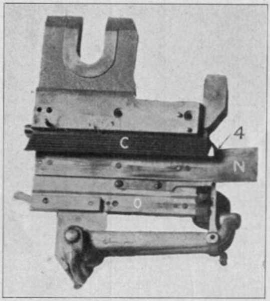 The matrix catch spring E should project through the assembler plate a sufficient distance to catch each matrix as it passes, and prevent it from falling back to the right.