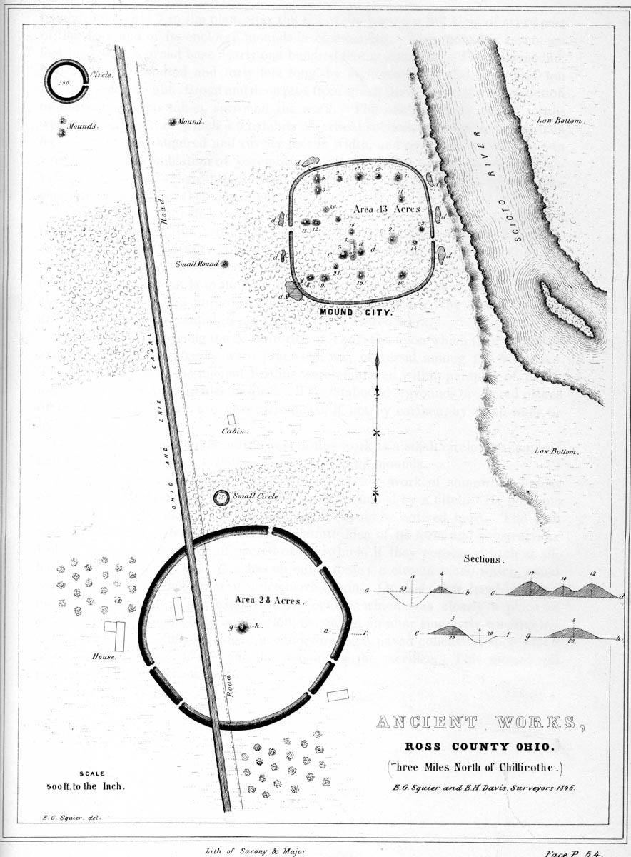 “The existence and progress of these investigations were made known to the Society by correspondence, early in the year 1846; and in June of that year, specimens of the relics recovered, accompanied by numerous maps and plans of ancient Earthworks and Sectional Views of the Mounds from which the remains were taken, were laid before the Society by Mr. Squier in person. These excited deep interest and surprise in all who saw them; and the Society immediately took measures to encourage further investigation, and secure the publication, under its own auspices, of the important results already obtained. A few months later, the chairman of the present committee, being in Ohio, was enabled, through the kindness of Messrs. Squier and Davis, to visit several of the more important monuments in the immediate vicinity of Chillicothe; and among these ‘Mound City,’ so called, from which very many of the minor relics and specimens were procured. He was struck with the accuracy of the plans and drawings as well as of the accounts which had been laid before the Society; and bears full testimony to the fidelity and integrity with which the process of investigation and delineation has been conducted.