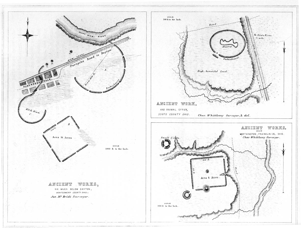 Among the most zealous investigators in the field of American antiquarian research, is CHARLES WHITTLESEY, Esq., of Cleveland, formerly Topographic Engineer of Ohio. His surveys and observations, carried on for many years and over a wide field, have been both numerous and accurate, and are among the most valuable, in all respects, of any hitherto made. Although Mr. Whittlesey, in conjunction with JOSEPH SULLIVANT, Esq., of Columbus, Ohio, originally contemplated a joint work, in which the results of his investigations should be embodied, he has nevertheless, with a liberality which will be not less appreciated by the public than by the authors, contributed to this memoir about twenty plans of ancient works, which, with the accompanying explanations and general observations, will be found embodied in the following pages. Relating principally to the aboriginal monuments of northern Ohio, (as do those of Mr. McBride to the remains of western Ohio,) they contribute much to the interest and completeness of this memoir. It is to be hoped the public may yet be put in possession of the entire results of Mr. Whittlesey’s labor, which could not fail of adding greatly to our stock of knowledge on this interesting subject.