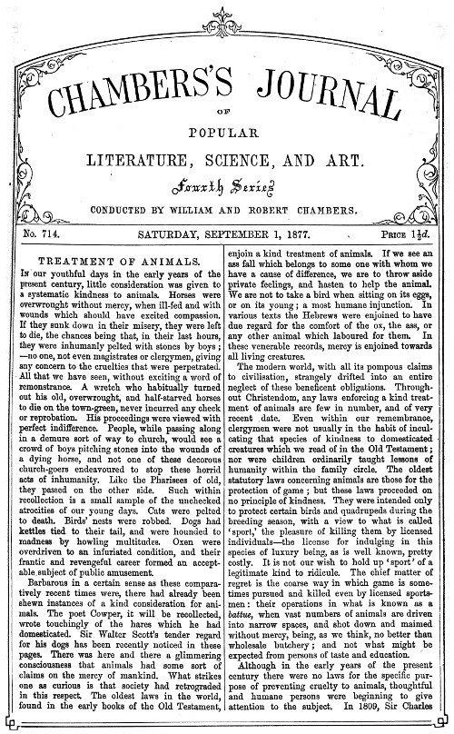 Barbarous in a certain sense as these comparatively recent times were, there had already been shewn instances of a kind consideration for animals. The poet Cowper, it will be recollected, wrote touchingly of the hares which he had domesticated. Sir Walter Scott's tender regard for his dogs has been recently noticed in these pages. There was here and there a glimmering consciousness that animals had some sort of claims on the mercy of mankind. What strikes one as curious is that society had retrograded in this respect. The oldest laws in the world, found in the early books of the Old Testament, enjoin a kind treatment of animals. If we see an ass fall which belongs to some one with whom we have a cause of difference, we are to throw aside private feelings, and hasten to help the animal. We are not to take a bird when sitting on its eggs, or on its young; a most humane injunction. In various texts the Hebrews were enjoined to have due regard for the comfort of the ox, the ass, or any other animal which laboured for them. In these venerable records, mercy is enjoined towards all living creatures.