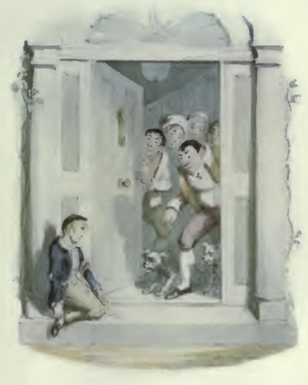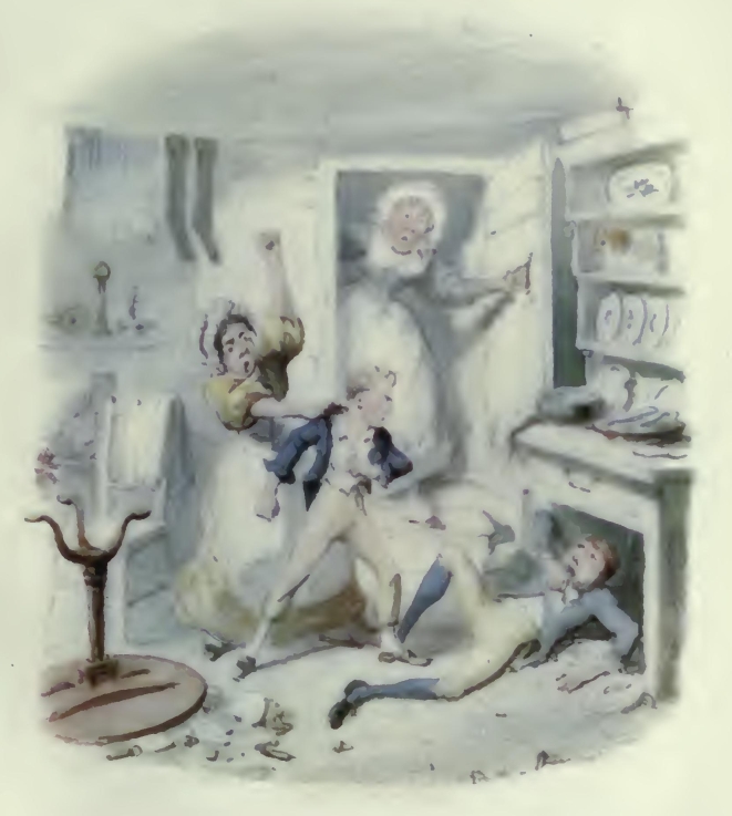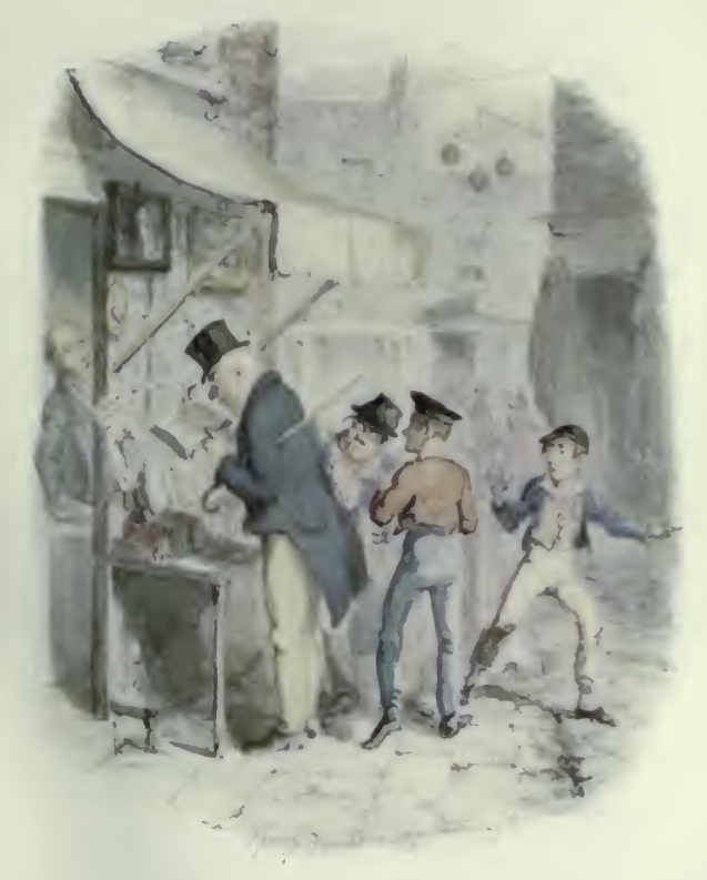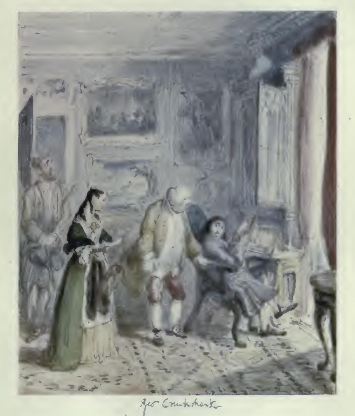 The story of the injury, fanciful or real, was lengthy and vexatious, and for the most part rather filled the minds of the artist’s best-wishers with dismay; but as there had never been offered during Dickens’s lifetime any sort of disproof that the ‘Parish Boy’s Progress,’ as a pictorial suite, was one of George Cruikshank’s numerous fruitful original suggestions, and The Miser’s Daughter scheme was obviously completely his own as regards the main idea of representing fashionable ‘Life in London’ in the days of Hogarth, just as ‘Life in London’ of his jaunty youth had been by his hand portrayed in the ‘Corinthian epoch’ of the sportive ‘Tom and Jerry’ doings under the Regency era, the question in some degree resolved itself into the distinctions between inspiration and clever hack-work, the art of making the best possible use of suggested materials, wherein the faculty of imagination makes the workman. The artist demonstrated that his genius invented both series graphically, that the drawings, in the first instance designed to simply tell the story on his own lines, later suggested the development of their ideas to his literary collaborateurs, at least as concerns the projection of Oliver Twist and The Miser’s Daughter alike, both series strongly characteristic of Cruikshank’s own peculiar genius; and confessedly the evidences of the drawings completely justify his not unreasonable contention.