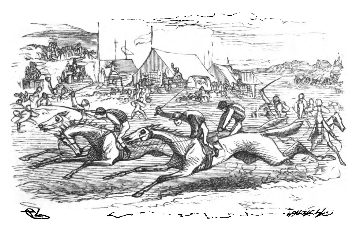 "The Derby Day is one of the most spirited sketches in this volume. The first three lines of our extract are excellent in their way, and have a fine healthy élan about them. The absence of the word 'trump' would render them eligible for quotation in much higher poetical company. The next verse, of a decidedly lower order, may still be given as a very fair reproduction of Hood's peculiar style and humour. Our author is telling how thé Derby favourite breaks his neck in the race:—