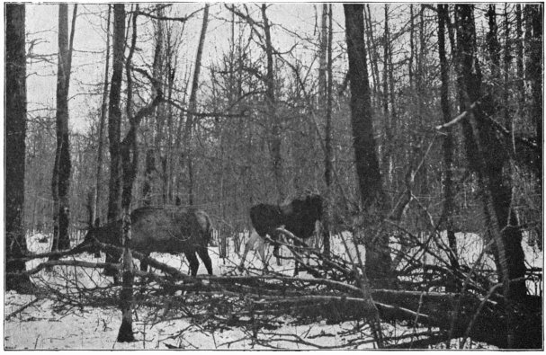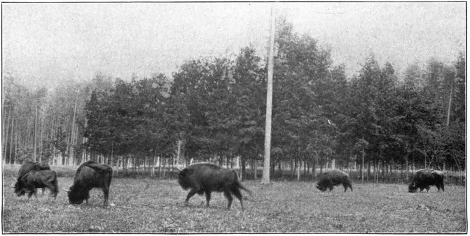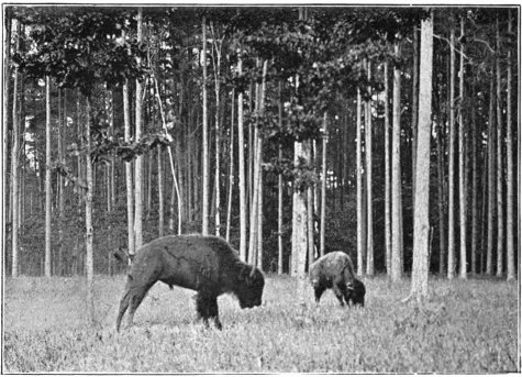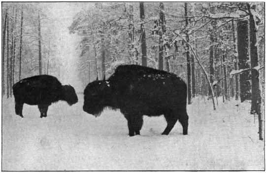 101 The great event was, however, reserved for the afternoon, when, after the twin elk calves had been driven out of one piece of forest and some of the wapiti out of another, the six bison, with the four Europeans leading and the Americans in the rear, burst out into the open in a heavy, lumbering gallop, which literally shook the earth, close to where my daughter was standing. It was indeed a magnificent spectacle. The “hustling” which the animals underwent during the drives made them somewhat fierce, with the result that two of the watchers had to spend the night on a shooting-stage.