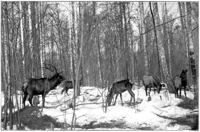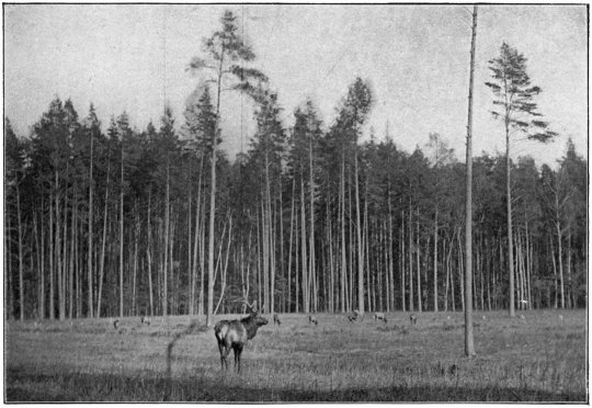 When founding the Pilawin preserve in 1901 my intention was limited to the breeding of elk, which still have their native haunts not very far away to the north, but have for many years ceased to inhabit these forests. No one, to my knowledge, has hitherto attempted to naturalise these splendid deer in enclosed parks; but the fact that Pilawin forms a part of their original habitat induced me to try the experiment, which has thus far proved an unqualified success. The first big game introduced in Pilawin were thus elk; but soon after their introduction I had the opportunity when in England ofviii visiting the famous park of the Duke of Bedford at Woburn, and the wonders there seen enlarged my ideas with regard to Pilawin. Without any thought of rivalling the marvels of Woburn, I accordingly decided to add to the Pilawin park such of the deer of North America and Asia as appeared likely to thrive in Russia. Consequently I lost no time in obtaining specimens of American and Siberian wapiti, as well as of Caucasian red deer and the Manchurian Dybowski’s deer, after which I continued to add other new inhabitants to the park as opportunity occurred. In 1905, thanks to the kind intervention of Prince Victor Kotchoubey, who is at the head of the Imperial estates, I received from H.M. the Emperor of Russia the valuable gift of three bison from the Imperial preserves of Bielowicz; while in the following year a pair of their Americanix relations, imported by Hagenbeck, was added to the herd.