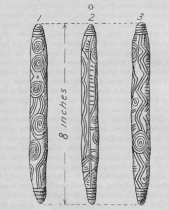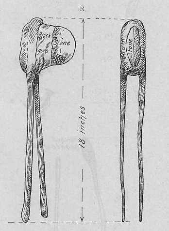 I had a splendid chance of replenishing our larder, and, fool that I was, I missed it. I was riding The Warden to the spring, when a kangaroo popped up on his hind legs, and sat looking at me. The Warden would not keep still; the surprised kangaroo actually waited for me to dismount and aim my rifle, but just as I fired The Warden jerked my arm and I missed, and away bounded many a good meal—and with it the pony! So I continued my way on foot, and was rewarded by finding some interesting things. A big camp of natives had been here in our absence; near the spring in the scrub was a cleared corroboree ground, twenty feet by fifty yards, cleaned of all stones and enclosed by a fallen brush-fence (this older than the other work, showing this is a favourite meeting-place). At one end was a sort of altar of bushes, and hidden beneath them a long, carved board. This I took, and afterwards gave to Sir John Forrest. In every tree surrounding the clearing a stone was lodged in the forked branches.
