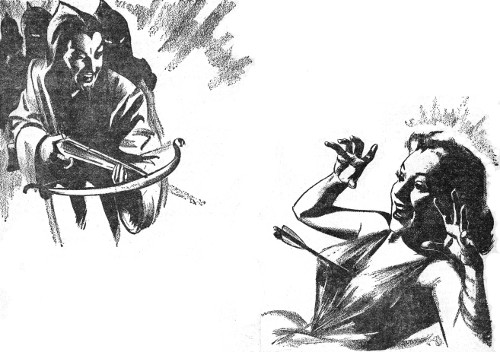 But suddenly, across the narrow gap before them, rose a dozen red-robed figures. In the fore was the menacing form of Bra Naan. Leveled at them was the deadly crossbow of the Priesthood.