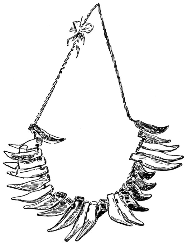 Perhaps the simplest and most natural transition from pictorial object to image writing is suggested by the trophy records of an African chief as described by Frobenius. The actual record trophies of leopard hunting—the leopard’s teeth—are taken and worn in a necklace by the chief and form a tribal record. The individual making the killing has, however, a wooden model of the tooth which he wears as an individual trophy. This very simple and natural proceeding has in it the germ of picture writing,—is indeed picture writing.
