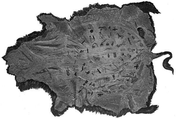 Primitive picture writing on other materials than human skin is found all over the world. It may be drawn, painted, engraved, chiseled, modeled, moulded, woven or inlaid. The petroglyphs or aboriginal rock carvings (more often engravings) and the paintings are the most typical kinds although perhaps not the most common. Both of these kinds are found all over the world; most famously perhaps among the Australians, the Bushmen and the North American Indians. The use by the North American Indians is said to have reached its highest development among the Kiowa and the Dakota tribes in their calendars. “These calendars are painted on deer, antelope, and buffalo hides, and constituted a chronology of past years. The Dakota calendars have a picture for each year ... while that of the Kiowa has a summer symbol and a winter symbol, with a picture or device representing some noteworthy event” (Hodge). It is said of the petroglyphs that they “record personal achievements and happenings more frequently than tribal histories ... are known often to be the records of the visits of individuals to certain places, signposts to indicate the presence of water or the direction of a trail, to give warning or to convey a message ... and many of them ... [are] connected with myths, rituals, and religious practices” (Hodge). “Sometimes a man painted his robe in accordance with a dream, or pictured upon it a yearly record of his own deeds or of the prominent events of the tribe.” “The horses of warriors were often painted to indicate the dreams of the war experiences of their riders.”