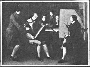 After graduation in 1773 Trumbull tried to paint with home-made materials. His art studies and experiments were interrupted by the opening of the Revolution. When war with England became imminent Trumbull began training the young men of the school and village, and, after the battle of Lexington, when the first regiment of Connecticut troops was formed, he was made adjutant. Afterward he became second aide-de-camp to General Washington, and when General Gates took command of the northern department he appointed Trumbull adjutant general, with rank of colonel, and in that capacity he took part in the unfortunate expedition to Albany and Ticonderoga. He resigned from the army in 1780 and went to London to study art under Benjamin West. Then came the news of the arrest and execution of Major André, which stirred England, and suggested the arrest of John Trumbull because he had been an officer of similar rank in the American army. He was imprisoned for seven months. In 1784 he was once more studying under West, and when there painted his two great pictures, the “Battle of Bunker Hill,” and the “Death of Montgomery.” In 1785 Trumbull visited Paris, and it was when there that he began his picture which is perhaps the most famous of all his work, the signing of “The Declaration of Independence.”