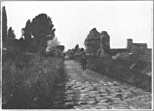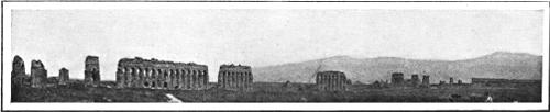 The most impressive features of the Campagna as we view it from the car window or in a stroll along either the old Appian Way or the modern Appian Way, are the ruins of aqueducts. The one here illustrated is the Claudia, named after Emperor Claudius, who completed it. Its sources were more than forty miles distant; while crossing the Campagna the water flowed in a channel supported by a series of gigantic arches. It provided Rome not only with her best water, but her most abundant supply, amounting to more than 400,000 cubic meters daily. All the aqueducts together poured into the city each day more fresh water than the Tiber now empties into the sea.