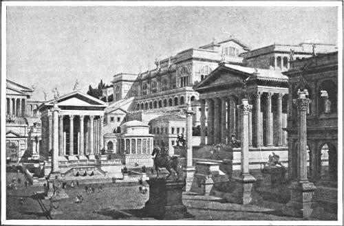 The city of Rome itself abounds in places and objects of interest more easily reached than the Campagna. It requires at least a teaspoonful of information to appreciate the features of Rome; and to those who are mentally equipped no spot furnishes keener enjoyment than the Forum. An impressive view can be had looking eastward from the Capitol, one of the “seven hills” on which the early city sat. It can be seen that the Forum lies in a valley nearly surrounded by hills. In the tenth and ninth centuries B. C. these hilltops were occupied by villages and the valleys between them were marshes. In the eighth century the villages united to form one city,—Rome,—and the marshes were gradually drained by means of sewers. The low area became at that time the Forum, “marketplace” of the new city. It is an approximate oblong, on the north side of which one of the kings marked off a space,—the comitium (assembly-place),—in which all the citizens met to vote on questions of public importance. Adjoining the comitium was the senate-house. King (afterward two consuls), senate, and popular assembly constituted the government. The Forum was therefore the political center of Rome, and from this circumstance it derives all its interest. When one reflects that for nearly five centuries after the downfall of the kings (509-27 B.C.) Rome was a republic, that during that time she conquered and organized in her empire practically the whole Mediterranean basin, we begin to understand that this spot must have been the scene of stupendous political conflicts, the birthplace of far-reaching legislative and administrative measures. Here worked the brain of the best organized and most enduring empire the world has known.