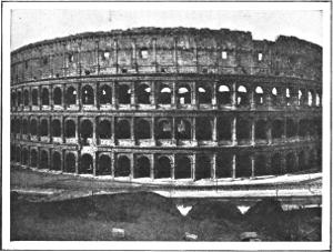 Some of the most imposing palaces which lend dignity to the modern city have been built with this material. Although fully half the stone has been thus removed, the part of the structure which still remains is the most impressive of all the ruins of the city—a monument of the grandeur and of the moral degradation of Rome. It is an especially rich experience to visit the Colosseum by moonlight, where, seated on a stone at the edge of the arena, we may in imagination, with the aid of the tranquil light, reconstruct the vast interior and repeople it with a Roman multitude breathlessly awaiting the opening of the games or exulting over the triumph of a popular favorite. On certain nights the municipal authorities illuminate the interior with colored lights, whose weird spell awakens the imagination to sights of bloody conflict amid a yelling, savage mob.