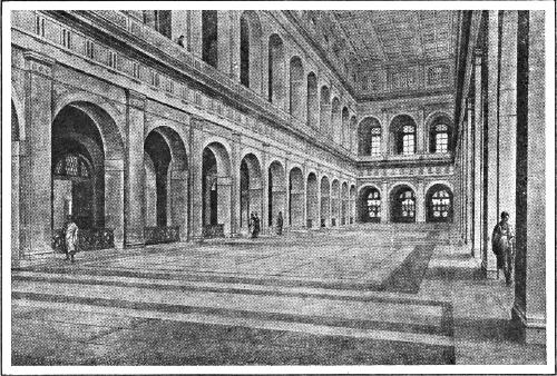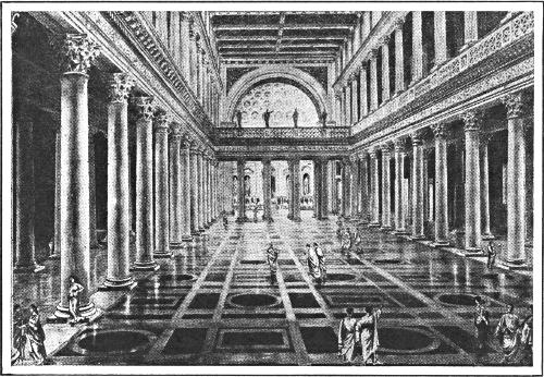 A few steps from the temple is the pavement of a great oblong building, of whose superstructure there are but scant remains. This was the Basilica Julia, erected by Julius Cæsar, and rebuilt, after a destructive fire, by Augustus. A basilica was used for law courts and for business purposes. The style of building was borrowed from Greece; but the architect at Rome wrought in the spirit of her people. He left the exterior plain and unattractive, to devote his whole attention to the interior. It is essentially a vast hall, with aisles separated from nave by a row of arched piers in this case, in other basilicas by colonnades. The designer molded, as it were, the interior space, so as to express in the language of art the grandeur of the empire, and in the severe harmony of the lines the orderliness and symmetry of Roman law. No other architectural type so well embodied the imperial idea.