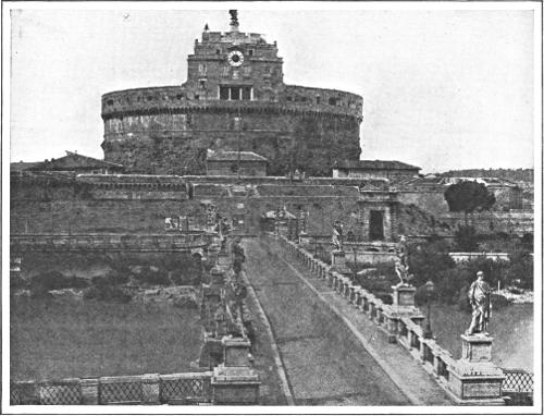 “Hadrian’s Tomb” is a large circular tower, 230 feet in diameter. It was originally built of Parian marble. Some time in the fifth century, however, it was converted into a fort, and when the Goths under Vitiges besieged it in 537 the defenders tore the statues from their pedestals and hurled them down upon the attackers. Two of these were found during the seventeenth century in the moat surrounding the tomb.