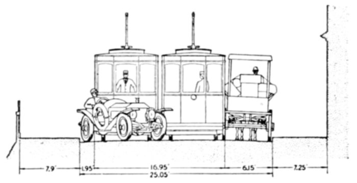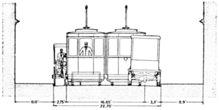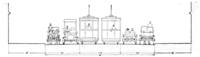 [39] In estimating the gross tonnage, the following average weights were used: a street car with average load—19 tons; a heavy wagon (including team), averaging loaded and empty vehicles—4 tons; a light wagon (including team), averaging loaded and empty vehicles—1.75 tons; an automobile or carriage (including team),—.9 tons; pedestrians and passengers are figured at 150 pounds apiece.