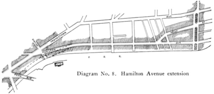 [40] Estimating heavy and light wagons, including team and load at $125 per ton; carriages and automobiles, including teams, at $300 per ton; cars at $160 per ton and live stock at $200 per ton, we get an average tonnage value of $150 over the Sixth Street, Seventh Street[41] and Ninth Street bridges, and $125 over the Sixteenth Street, Thirtieth Street and Forty-third Street bridges.