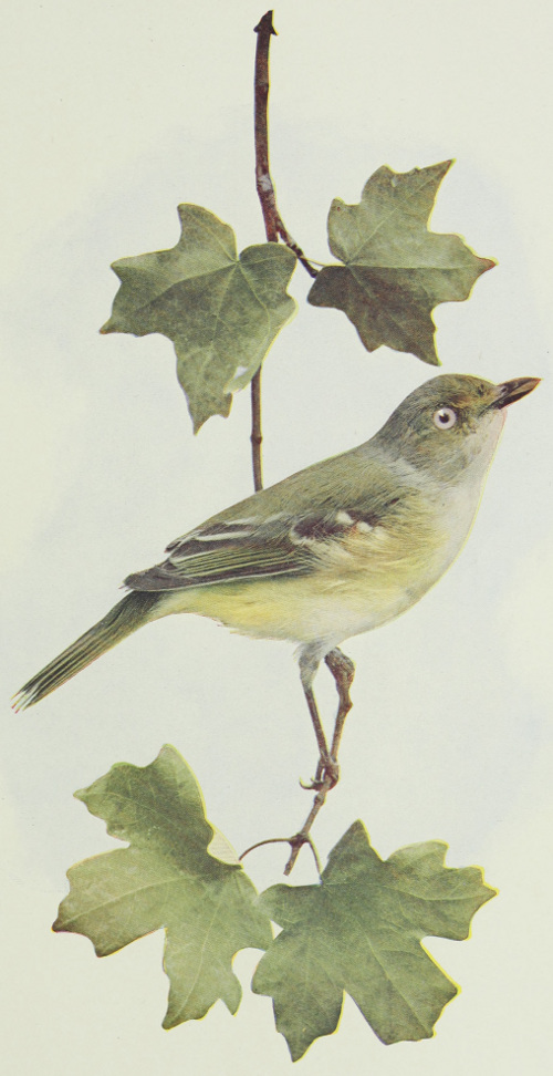 The vireos form a peculiar and interesting family—the Vireonidæ, which includes about fifty species. All are strictly American and the larger number inhabit only the forest or shrubby regions of Central and South America. The name vireo signifies a green finch and is from the Latin word meaning “to be green.” The body color of nearly all the species is more or less olive green.