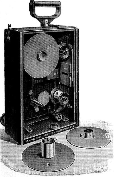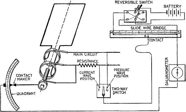 Ans. For current wave measurement switch No. 1 is placed on contact F, and for pressure wave measurement, on contact G, switch No. 2 is now turned to M and the drop across the resistance (assuming switch No. 1 to be turned to contact F) measured by charging the condenser, and then discharging it through the galvanometer by turning the switch to S. This is repeated for a number of positions of the contact maker, noting each time the galvanometer reading and position of the contact maker. By plotting the positions of contact maker as abscissæ, and the galvanometer readings as ordinates, the curve drawn through them will represent the wave form. 1845