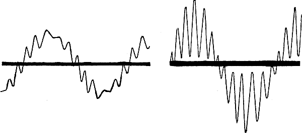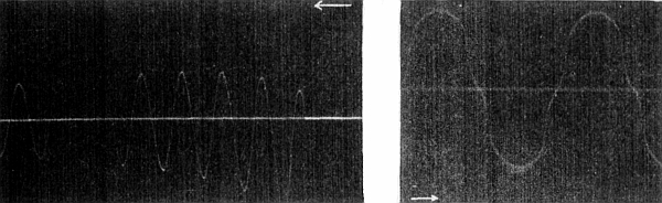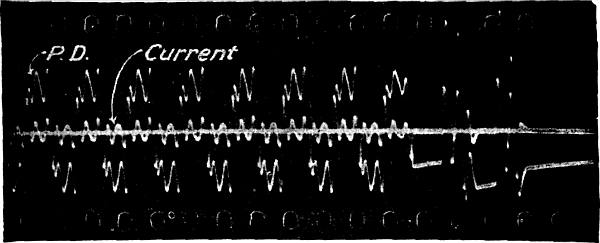 Figs.. 2,593 and 2,594.—Two curves representing pressure and current respectively of a rotary converter. Fig. 2,593, pressure wave V, fig. 2,594 current wave C. These waves were obtained from a converter which was being driven by an alternator by means of an independent motor. The rotary converter was supplying idle current to some unloaded transformers and the ripples clearly visible in the pressure wave V, correspond to the number of teeth in the armature of the rotary converter.