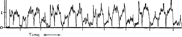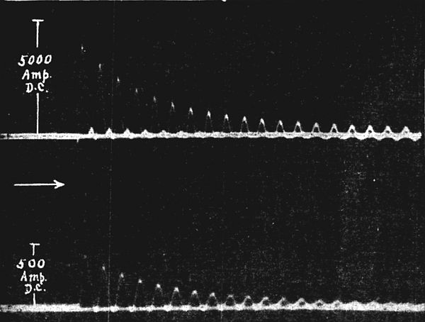 Fig. 2,587.Oscillogram by Bailey and Cleghorne (Proc. I.E.E., Vol. XXXVIII), showing the sparking pressure or pressure between the brush and the commutator segment at the moment of separation. The waves fall into groups of three owing to the fact that there were three armature coils in each slot.