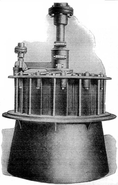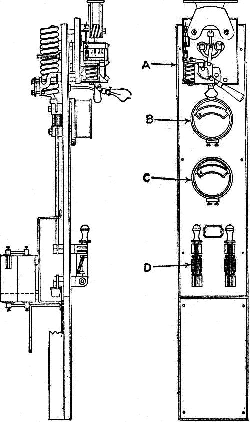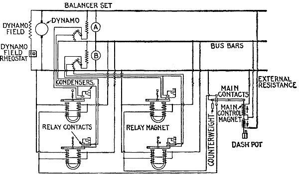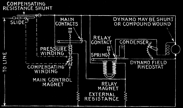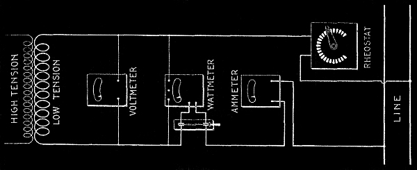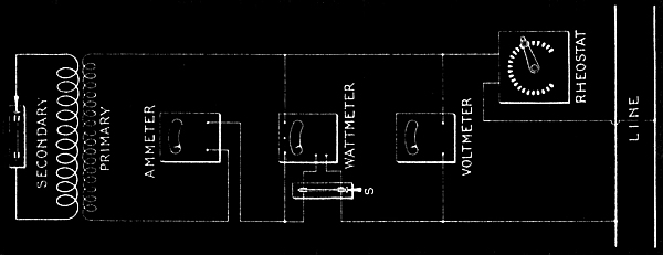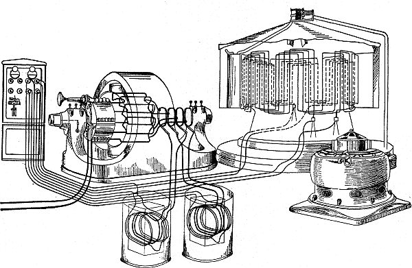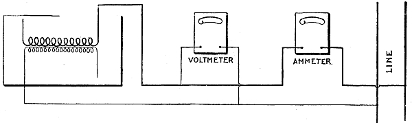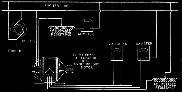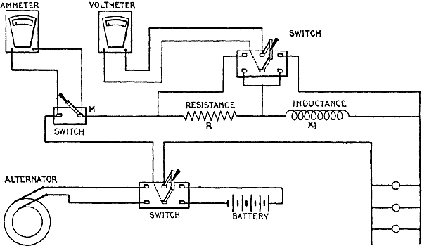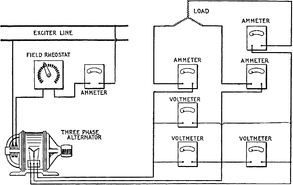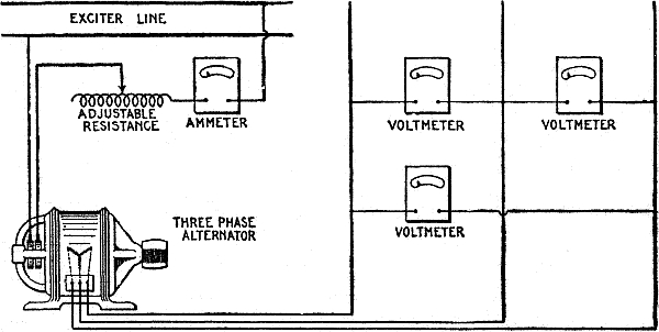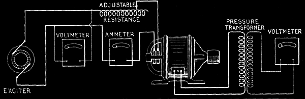The necessary arrangement or connection of the generator from which it is desired to obtain a characteristic curve, consists in providing a constant motive power so that the machine may be run at a uniform speed, and when the field magnets of the generator are separately excited the field current from the outside source must also be maintained constant, preferably by a rheostat connected in the field of the auxiliary exciting machine. It is also necessary in every case that means be provided for varying the main current of the generator step by step from zero to maximum. This may best be done by employing a water rheostat, as shown in fig. 2,909.