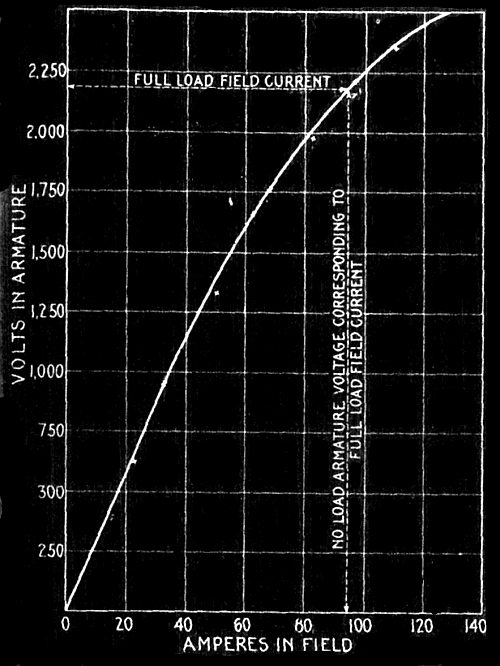 The working portion of the curve is from A to C, at which time the machine is supplying a fairly constant voltage. From C to E shows a critical condition of affairs, while the straight portion D O represents the unstable part of the curve caused by the field current being below its proper value.