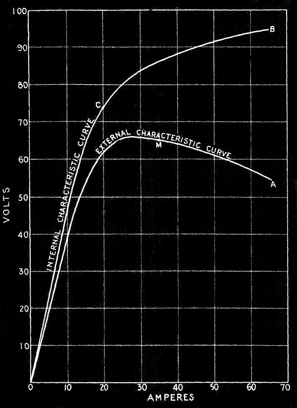 Ans. An examination of the curve shows that the highest 2109 point of the curve occurs at no load or 0 amperes; that as the current is increased, the voltage drops, first slightly to the point B and then rapidly until the point E is reached, when any further lowering of resistance in the main circuit to increase the current causes not only a rapid decline in the voltage but also of the current until both voltage and current become approximately zero.