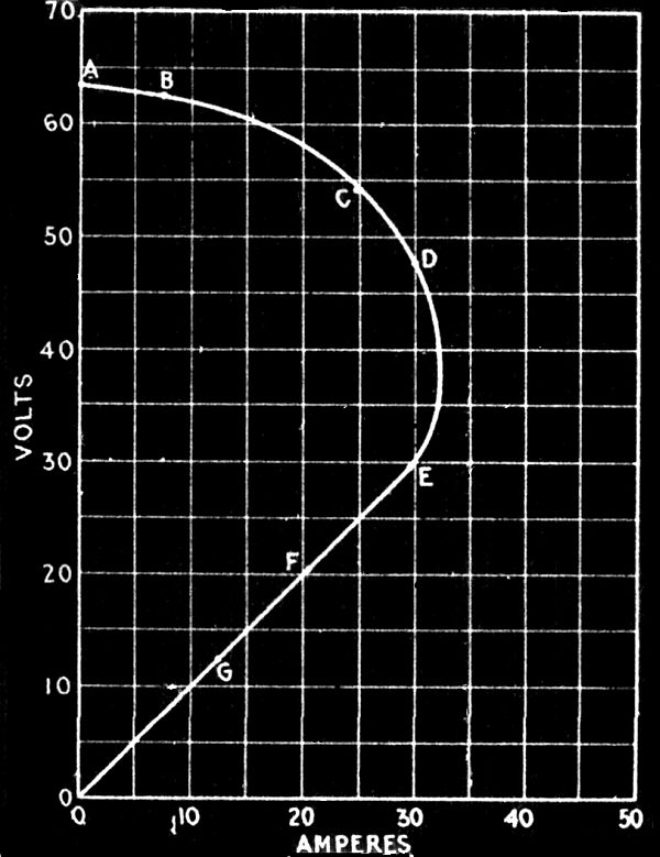 Fig. 2,911.—Characteristic curve of shunt dynamo. Suppose in making the test, the deflections on the meters for the first readings be 63 volts and 0 amperes, the plotting of these values will give the first point on the curve. Similarly, the second readings with main circuit closed and maximum resistance in the water rheostat may be assumed to be 62.5 volts and 7.5 amperes, which plotted gives the second point B. A still further lowering of the plate will permit a stronger current in the main circuit, and the value of this together with its corresponding voltage will give a third point for the curve. Neither for this reading, however, nor for the following readings of the test should the field rheostat be altered. When six or eight points ranging from zero to a maximum current have been obtained and plotted, a curved line should be drawn through them such as shown through ABCDEFG0, the characteristic curve of the dynamo. While the curve may be sketched in free hand, it should preferably be drawn by the aid of French curves. In case the French curve cannot be exactly made to coincide with all the points as for instance C and D, it should be run in between giving an average result, and smoothing out irregularities, or small errors due to the "personal equation." The meter of course must be correct or calibrated and the readings corrected by the calibration coefficient.