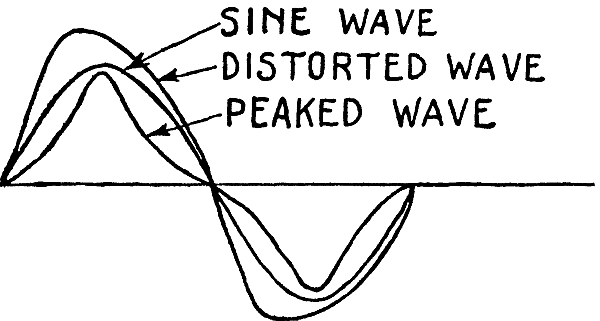 Fig. 2,588.—Various wave forms. The sine wave represents a current or pressure which varies according to the sine law. A distorted wave is due to the properties of the circuit, for instance, the effect of hysteresis in an iron core introduced into a coil is to distort the current wave by adding harmonics so that the ascending and descending portions may not be symmetrical. A peaked wave has a large maximum as compared with its virtual value. A peaked wave is produced by a machine with concentrated winding.