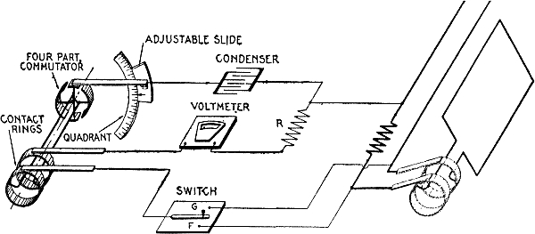 Fig. 2,590.Four part commutator method of wave form measurement. The contact device consists of two slip rings and a four part commutator. One slip ring is connected to one terminal of the source, the other to the voltmeter, and the commutator to the condenser. By adjusting R when a known direct current pressure is impressed across the terminals, the voltmeter can be rendered direct reading.