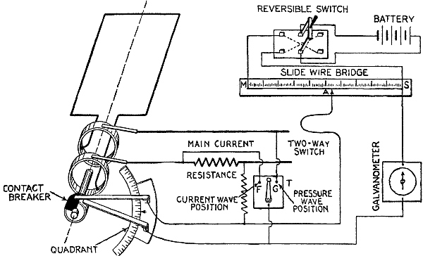 Ans. The contact breaker is placed in successive positions and galvanometer readings taken, the switch being turned to F, fig. 2,592, in measuring the current wave, and to G in measuring the pressure wave. The results thus obtained are plotted giving respectively current and pressure waves.