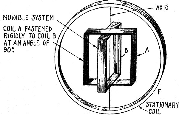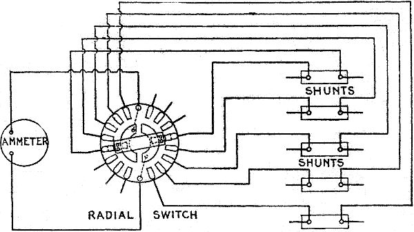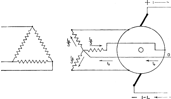 Fig. 2,591.Modified four part commutator method of wave form measurement (Duncan's modification). By this method one contact maker can be used for any number of waves having the same frequency. Electro-dynamometers are used and the connections are made as here shown. The moving coils are connected in series to the contact maker, and the fixed coils are connected to the various sources to be investigated, then the deflection will be steady and by calibration with direct current can be made to read directly in volts.