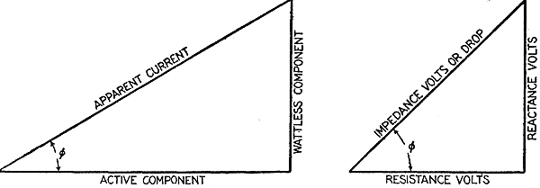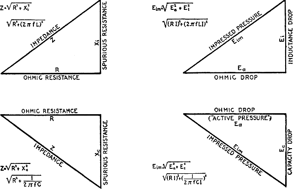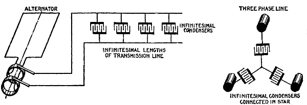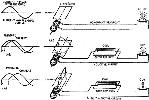 Effects to be considered in making calculations—induction; self- and mutual; mutual induction, how caused—transpositions—inductance per mile of three phase circuit, table—capacity; table—frequency—skin effect; calculation; table—corona effect; its manifestation; critical voltage; spacing of wires—resistance of wires—impedance—power factor; apparent current; usual power factors encountered; example—wire calculations—sizes of wire—table of the property of copper wire—drop; example—current—example covering horse power, watts, apparent load, current, size of wire, drop, voltage at the alternator, and electrical horse power.