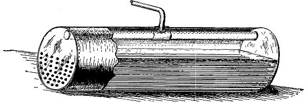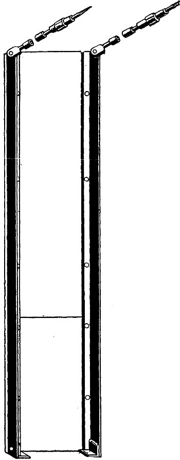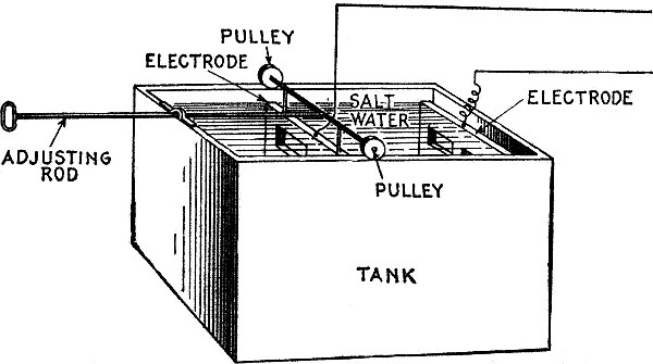 Fig. 2,909.—Water rheostat. It consists essentially of a tank of suitable size containing salt water into which are placed two electrodes having means of adjustment of the distance separating them. The solution depends on the voltage. Pure water is seldom used for pressures under 1,000 volts. The size of the tank is determined by the size of the electrodes, and roughly the size of the latter equal the number of amperes. With a current density of one ampere per square inch, a water solution gives a drop of 2,500 to 3,000 volts per inch distance between the plates. Where high voltage is used, the water must be circulated through and from the tank by rubber hose allowing for 2,500 volts, a length of 15 to 20 feet of 1 inch hose to prevent grounding. In place of the arrangement shown above, a barrel may be used for the tank, and for the electrodes, coils of galvanized iron wire. This is the simplest form and is satisfactory.