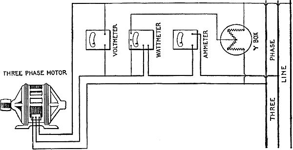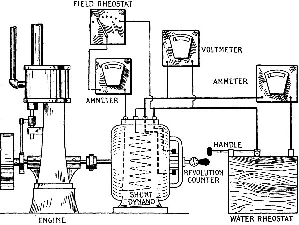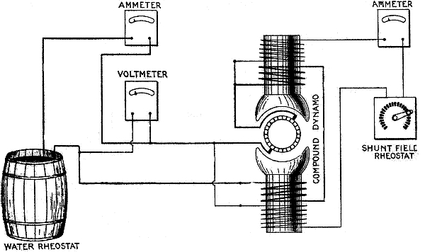 Fig. 2,910.—Connections for test of dynamo. During the test, one man should be assigned to the tachometer, another man to the water rheostat, and there should preferably be one man at each of the electrical measuring instruments. In order to enable the man at the tachometer to keep the speed constant, he should be in communication either directly or indirectly with the source of the driving power, and the man at the water rheostat should be in plain view of the man reading the ammeter so that the latter party may signal him for the proper adjustment of the rheostat in order that the desired increase of current be obtained for each set of readings.