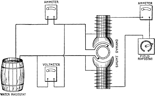 2108 Ans. Having completed the preliminaries as in fig. 2,910, the test should be started with the main circuit of the generator open. Then, in the case of the shunt machine, the speed should be made normal and the field rheostat adjusted until the voltmeter reading indicates the rated voltage of the machine at no load and readings taken. The electrodes of the water rheostat should be adjusted for maximum resistance and main circuit closed, and a second set of readings taken. Several sets of readings are taken, with successive reductions of water rheostat resistance. The results are then plotted on coordinate paper giving the characteristic curve shown in fig. 2,908.