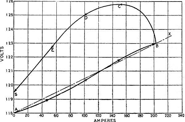 Fig. 2,912.—Characteristic curves for a compound dynamo. If the machine be over compounded, the characteristic curve has the form of the curve A B, which curve was obtained from a machine over-compounded from 118 to 123 volts, and designed to give 203 amperes at full load. The preliminary arrangements for testing a compound dynamo are similar to those for a shunt generator, and if the shunt across the series field winding be already made up and in position, the readings are taken precisely in the same manner. It is generally considered sufficient if observations be recorded at zero, ¼, ½, ¾ and full load. If it be desired to ascertain the effect which residual magnetism has upon the field magnets the current is decreased after the full load point is reached without opening the circuit, and readings are taken in succession at ¾, ½, ¼ and zero load giving in this case the curve B C D E S. It is thus seen that residual magnetism exerts no small effect upon the voltage obtained at the different loads, for had there been no residual magnetism in the field magnets the curve B C D E S would have coincided with the curve A B. The curve A B, and the straight line A X drawn through the points A and B, are almost identical, and as A X represents the theoretical characteristic curve for the machine, it is seen that compounding is practically perfect. In order to insure such accurate results being obtained, providing the machinery be correctly designed, requires considerable care in taking the readings; for example, each step or load on the ascending curve should not be exceeded before the corresponding deflection is taken, else the residual magnetism will cause the pressure reading to be higher than it actually should be, and the following pressure readings will also be affected in the same manner. In case the shunt to be employed across the series field has not been made up, it is advisable to perform a trial test before taking the readings for the curve as previously described. The trial test consists in taking two readings,—one at no load and the other at full load, the shunt being so adjusted as to length and section that the desired amount of compounding will be obtained in the latter reading with normal voltage at no load. If the first trial fail to produce the desired result by giving too low a voltage at full load, the length of the shunt across the series field should be increased, or its section should be reduced by employing a less number of strips in its makeup; again, if the voltage at full load be higher than that desired, there must be made a decrease in length or an increase of section in the shunt employed.
