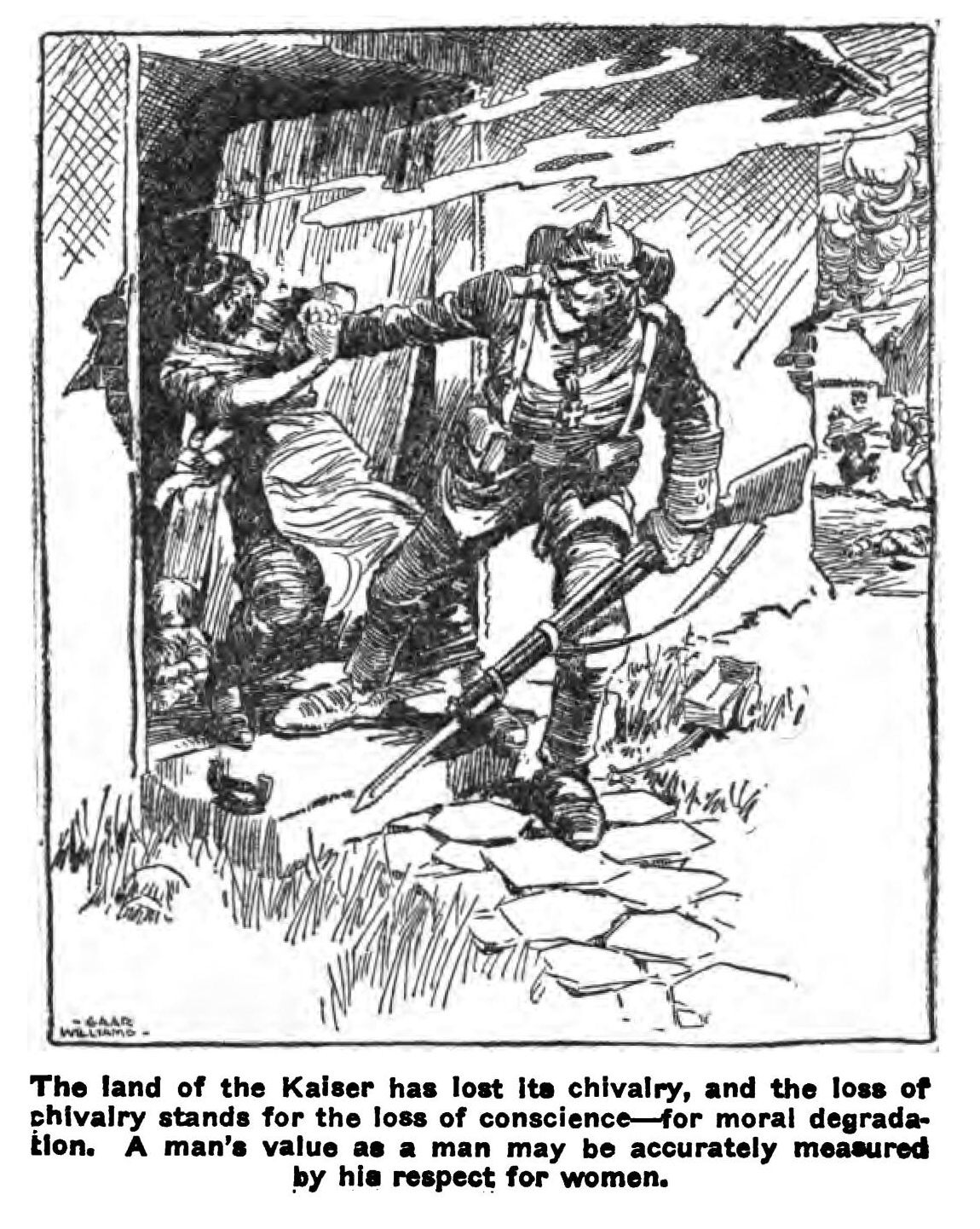 “This brotherhood of slaves has been created by the leprous soul of Bill Hohenzollern. He has broken down the will of the average man in Germany and established his own in place of it. He has yoked his people with the slaves of Turkey and Bulgaria, and with them has overawed the will of the Austro-Hungarians, mostly a decent people. The will of the Kaiser has spread over middle Europe like a plague. The name of the plague is Williamism. We have caught it in America.”