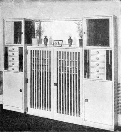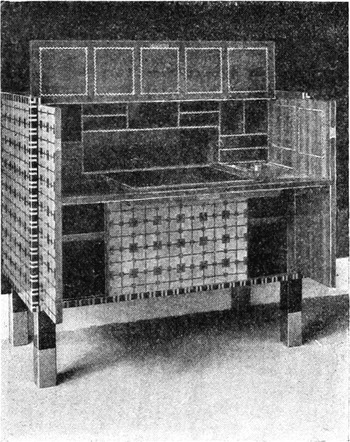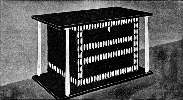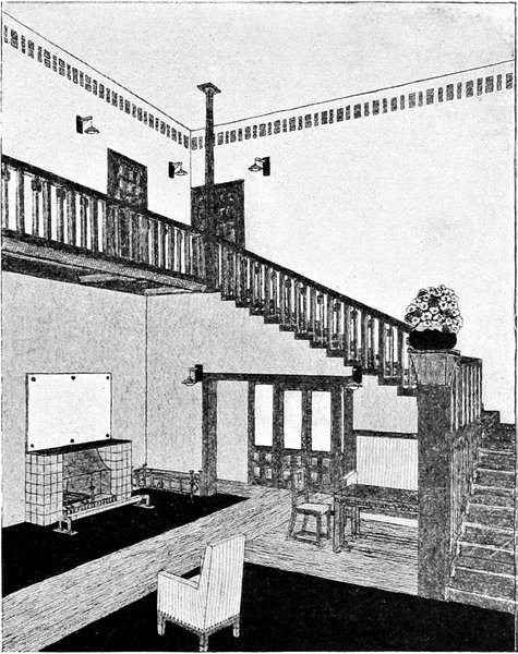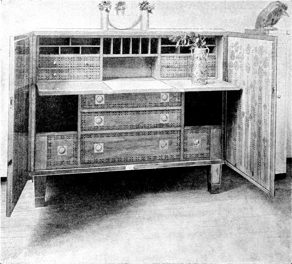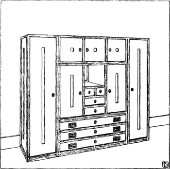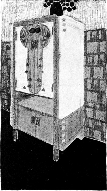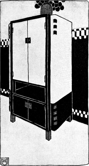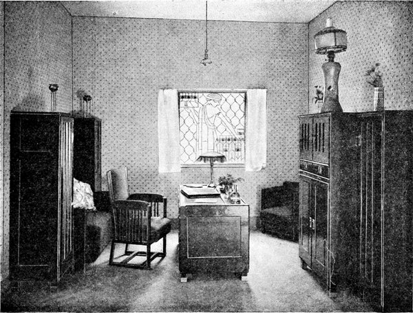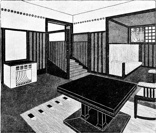 Das Studium alter Kulturen hat uns gelehrt, daß je erhabener die Kunst, desto größer die Einfachheit war. Wenn wir wollen, daß die Kunst ihren Ausgangspunkt in dem Hause nehme, dann müssen wir aus unseren Häusern alle überflüssigen und störenden Gegenstände fortnehmen, den sogenannten Luxus, den Komfort, der in Wirklichkeit gar kein Komfort ist, weil er nur unnötige Plage macht und für nichts gut und nützlich ist. Der wirklichen Gebrauchsgegenstände sind verhältnismäßig wenige. Wenden wir uns einmal an die kleinste Wohnung, die von einer alleinstehenden Person bewohnt wird, an das sogenannte Junggesellenheim, so finden wir in der Regel ein einziges Zimmer, in dem geschlafen und gearbeitet wird, wobei eine Arbeit vorausgesetzt ist, die nicht viel Unordnung verursacht. Wir finden darin einen Bücherschrank, der eine Menge Bücher enthält, ein Bett, das mit weißen weichen Leinenvorhängen, die mit Aufnäharbeit versehen, abnehmbar und waschbar sind, verschlossen ist, und bei Tag, wenn die Vorhänge, die in metallenen Ringen laufen, zurückgezogen sind, als Divan benützt werden kann. Das Nacht[S. 101]kästchen, wie ein einfaches Schränkchen gebaut, dient bei Tag als Bücherablage, als Ständer für Vasen und Rauchzeug. Dann ein Tisch, der sicher steht, um daran zu schreiben oder zu arbeiten. Mehrere Stühle, die sich leicht von einem Ort an den anderen bringen lassen, ein Kleiderschrank mit Schubkästen für Wäsche und derlei, und solche Bilder und Stiche, als es die Mittel erlauben, ja keine Lückenbüßer, sondern wirkliche Kunstwerke, was heute unschwer für wenig Geld zu haben ist; auch eine oder zwei Vasen gehören hieher, um Blumen hineinzutun, namentlich wenn man in einer Stadt lebt. Ein Ofen gehört natürlich ins Zimmer, aber man zieht einen kleinen Gaskamin vor, der, artig von einem Holzgehäuse umgeben, an seinem Bord allerlei, Gegenstände der Kleinkunst aufzunehmen geeignet ist.