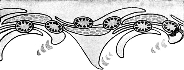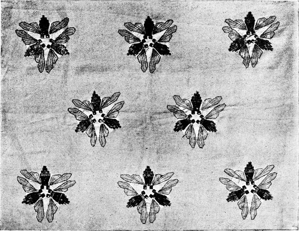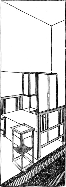 4. Man wird vielleicht Bilder in diesem Schlafzimmer anbringen wollen. Man hänge keine goldenen Rahmen auf den Grund der Tapete, sondern treffe eine solche Anordnung, daß die Malerei einen tektonischen Teil der Wand selbst bildet. In andern Worten, man[S. 130] wähle einen Fries oder ähnliche andere dekorative Malereien, die man seinem Urteile nach für gut findet. Das Werk muß einigermaßen mehr sein als interessant; es muß beitragen zur frischen und ursprünglichen Farbengebung, die man als passend für ein Schlafzimmer findet, und man führt sie daher so durch, daß die Malerei nicht aus der Mauer hervorspringt, sondern flächig wirkt, und im ganzen eine ebenso wirkungsvolle als bescheidene Rolle spielt.