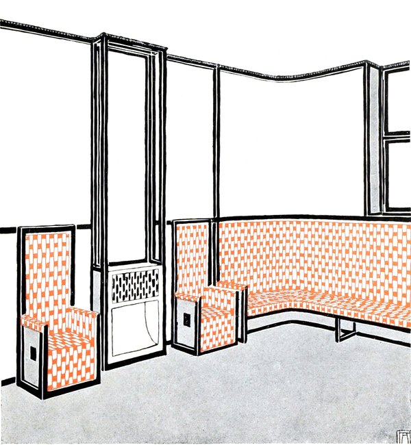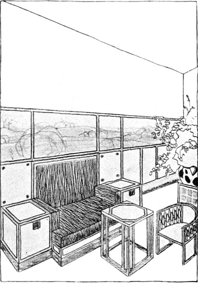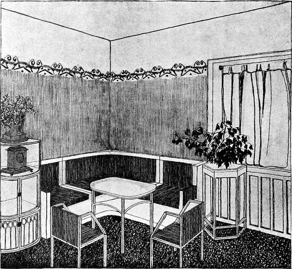 Wo diese Auffassung platzgreift, stellen sich die neuen Grundsätze für die zweckmäßige Einrichtung ungerufen ein. Die gute Hausfrau, die bereits gemerkt hat, um was es sich handelt, weiß nun mit einemmal, was sie für ihren Salon braucht. Sie wird Wände und Plafond in einfachen ruhigen Farben halten, vielleicht einfärbig bloß mit einem herumlaufenden Fries, oder sie wird, wenn sie Stofftapeten haben will, zu einem modernen Muster greifen. In Stofftapeten ist auch mehr Farbenfreude und Lebhaftigkeit der Zeichnung statthaft. Sie wird die Möbel so einfach, aber auch so gediegen herstellen lassen als möglich, vielleicht aus Mahagoni oder rotgebeiztem Holz, mit dem sich auch weiße Lackmöbel gut verbinden lassen. Die Möglichkeiten sind nicht auszudenken, der gute Geschmack wird mit allen Mitteln das richtige treffen. Die Anordnung der Möbel wird selbstverständlich von der bisherigen Aufstellung sehr verschieden sein müssen. Man wird in einem solchen intimen Raum Wert darauf legen, eine gemütliche Plauderecke zu besitzen, ein[S. 73] cozy-corner, das eine Ecke des Zimmers füllt, eine halbkreisförmige gepolsterte Sitzgelegenheit enthält, und ein Tischchen davor, wo man behaglich sitzen kann, den ganzen Raum beherrscht und sich dennoch abgeschlossen und geborgen fühlt. Das Fenster, das bei der Art unserer Zimmer leider so wenig Raum an der Wandseite läßt, wird einfach zur unteren Hälfte verkleidet, wenn es sich nicht anders tun läßt. Von[S. 74] diesem Platze aus ergibt sich die geschmackvolle Aufstellung der anderen Möbelstücke, die immer nur nach Maßgabe des persönlichen Bedürfnisses vorhanden sein werden, ganz leicht.