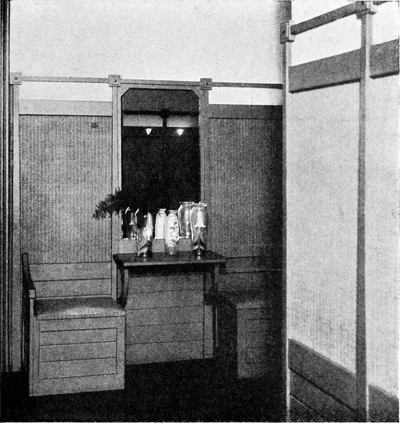 Der erste Schritt, den wir in eine Wohnung tun, belehrt uns gewöhnlich, wessen Geistes dieses Heim ist. Der Vorraum, den wir zuerst betreten, ist schon für alle anderen Räume bezeichnend. Die Persönlichkeit färbt überall ab. Ein Haus, dessen Neben- und Nutzräume nicht in Ordnung sind, wird auch nicht ein einziges Gemach besitzen, das volles Behagen gewährt. Umgekehrt wird sich ein ordnender und liebenswürdiger Hausgeist auch bis auf die äußerste Schwelle bemerkbar machen. Praktisch betrachtet, hat ein Vorzimmer zwei Aufgaben zu erfüllen. Es dient als Warteraum für den Besuch, der sich melden läßt, um nicht unvermittelt in die Gemächer zu treten. Der angemeldete Besuch benützt den Augenblick, Hut und Überkleider abzulegen und mit einem prüfenden Blick in den Spiegel sich über die Ordnungsmäßigkeit seiner Toilette zu versichern. Demnach ergeben sich als unerläßliche Möbelstücke: eine Kleiderablage für Röcke, Hüte, Stöcke und Schirme, ein Wandspiegel, der gewöhnlich damit in Verbindung steht, einige Sitzgelegenheiten, am besten[S. 45] einfache Stühle und ein Tischchen mit Lade. Die Hausfrau erkennt eine weitere Aufgabe des Vorzimmers darin, daß sie es zur Aufnahme ihrer eigenen Kleiderschränke einrichtet. Denn bei den heutigen beschränkten Raumverhältnissen in Mietshäusern und den neuen Raumgestaltungsprinzipien sucht man derartige große Wandschränke aus den Wohnzimmern zu bannen und ins Vorzimmer zu verlegen. So mag man denn an allen Wänden gleichförmige Schränke finden, die aus einem Stück, jedoch in viele Teile zerlegbar, bestehen können. Man wird aber gut tun, die ganze Wandhöhe bis zum Plafond schrankartig abzubauen und die oberen Fächer, die Separattüren ober der Kopfhöhe haben, zur Aufnahme von allerlei Schachteln und sonstigen Effekten, wenig benützten Kleidern u. s. w. zu verwenden, denn in einem Haushalt werden leicht alle Fächer und Schränke zu wenig, um zu beherbergen, was sich im Laufe der Zeit ansammelt. Es kann aber auch, um nicht eine Wand für die Kleiderablage mit Spiegelteil opfern zu müssen, eine solche Kleiderablage und der Spiegel vorne an einem oder mehreren der Schränke angebracht, der Spiegel in eine der Schranktüren eingelassen, die Kleiderhaken neben den Schranktüren befestigt und solcherart alle vier Wände mit Schränken abgebaut werden. Selbstverständlich wird man weiches Holz zu diesem[S. 46] Zweck verwenden und in einer Farbe, am besten weiß, lackieren oder streichen. Als Bodenbelag findet man vielfach Matten, die mit einfachem Muster von Künstlern entworfen, durch die Prag-Rudniker Korbwarenfabrikation stark in den Handel gebracht werden und sich vortrefflich bewähren. Ein solcherart ausgestatteter Vorraum besitzt alle Vornehmheit und Anspruchslosigkeit, deren er bedarf, wenn er den Besucher auf die gastlichen Haupträume vorbereiten will. Unterordnung in den Hauptgedanken der Wohnungsausstattung ist hier Gesetz. Im Vorraum pflegt man gute Bilder und sonstige Kunstwerke nicht unterzubringen; schlechte soll man aus Geschmacksgründen noch weniger hinstellen, weil der Raum keine Trödelkammer sein soll und da leicht eine geringschätzige Meinung von [S. 48] den Inwohnern erwecken kann. Aber es ist keineswegs Grundsatz, daß aus den Vorräumen Kunstwerke, wie Bilder und Plastik, verbannt sein sollen, im Gegenteil, wenn das Haus weitläufig genug ist, und das Vorzimmer, wie es heute geschieht, mehr den Charakter einer »Hall« empfängt, fänden sie auch hier ausgezeichnet Platz und trügen von dem Geist und der Vorliebe der Bewohner freundliche Spuren über die Schwelle ihrer inneren Wohnräume hinaus und dem Besucher einladend entgegen. Wir mögen uns da nur einmal Goethe’s Beispiel vor Augen führen und sein Haus in Weimar rekonstruieren, wie es anfangs des 19. Jahrhunderts ausgesehen hat. Ohne glänzend zu sein, war alles höchst edel und einfach; auch deuteten verschiedene an der Treppe stehende Abgüsse antiker Statuen auf Goethe’s besondere Neigung zur bildenden Kunst und dem griechischen Altertum. Der Vorraum in der I. Etage trug die Zeichen »Salve« als freundliches Willkommen und einer der zwei Vorräume, wo man zu warten genötigt war, war durch ein rotes Kanapee und Stühle von gleicher Farbe überaus heiter möbliert; zur Seite stand ein Flügel und an den Wänden sah man Handzeichnungen verschiedener Art und Größe.